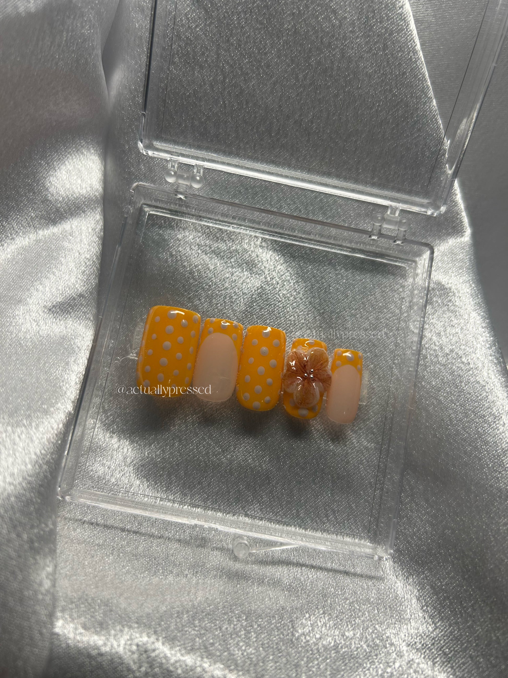 DOTTIE, a nail set with everyones favorite thing right now... polka dots & a cute little 3d flower. In the photo is what you will get being that this set is already made.