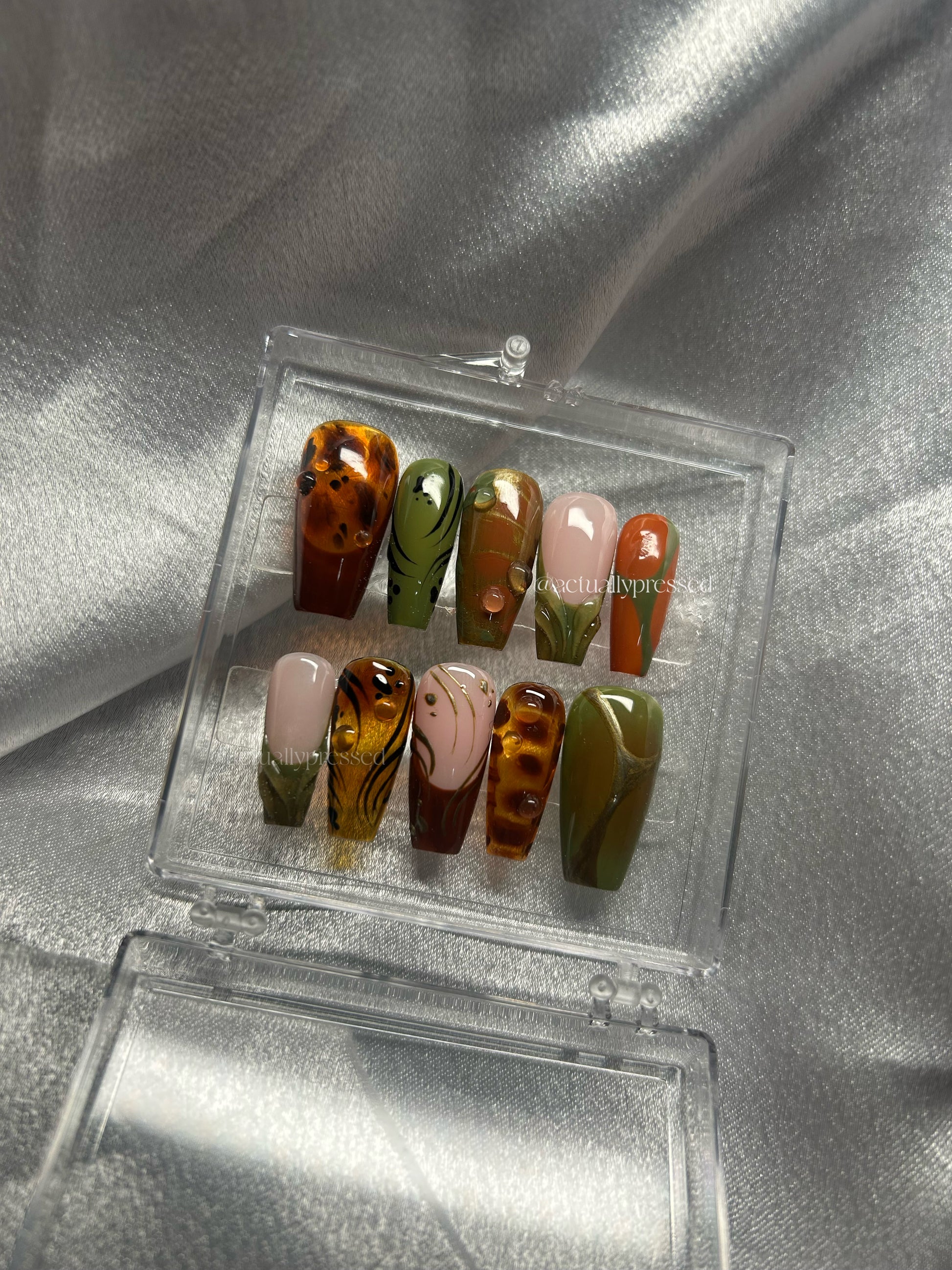 ENVY, a nail set with browns, & greens, animal prints, 3d aspects, line work, & more. In the photo is what you will get being that this set is already made.