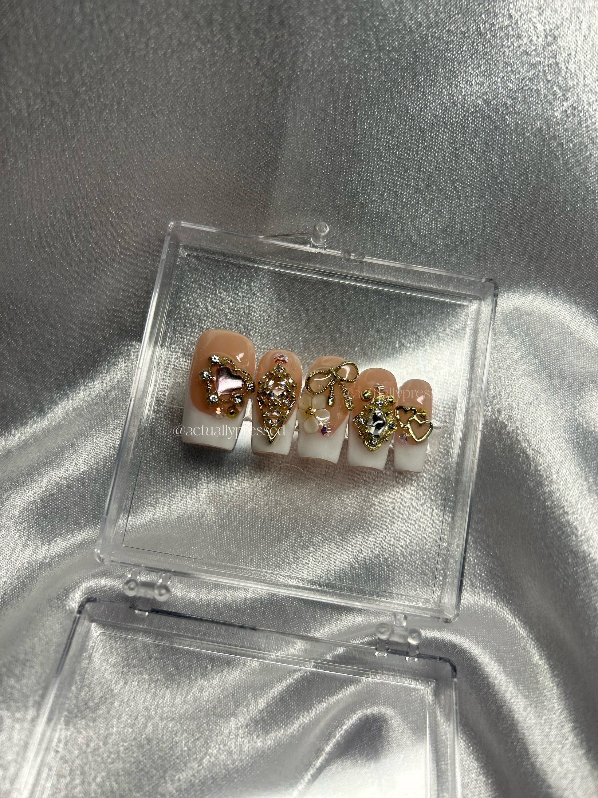 GIRLY, a nail set with white french tips with pretty pink bling, and flowers. In the photo is what you will get being that this set is already made.
