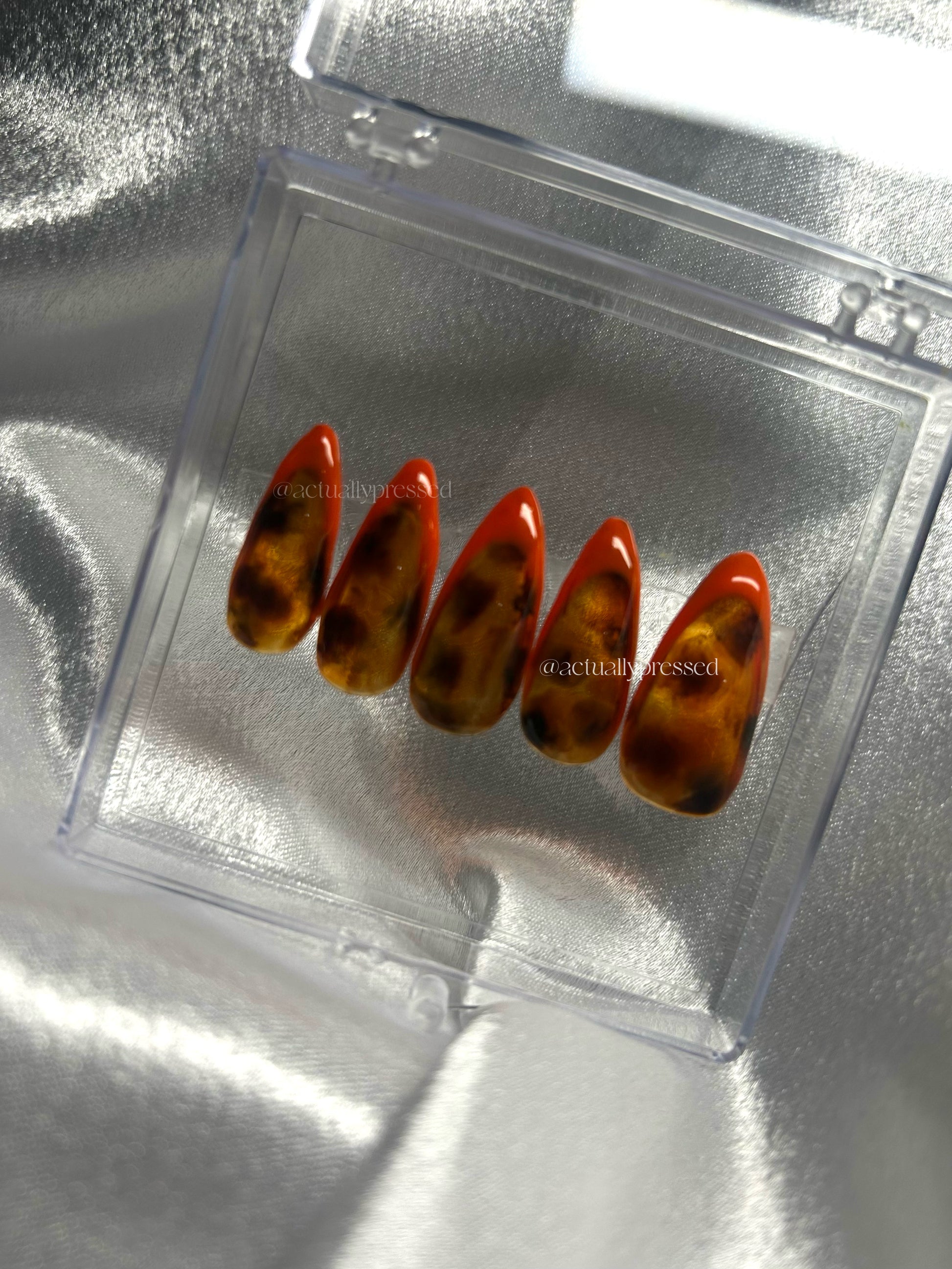 Sporty Torty, a nail set with the classic tortoise print with a neon orange deep french. In the notes you can change the orange color to any other color.