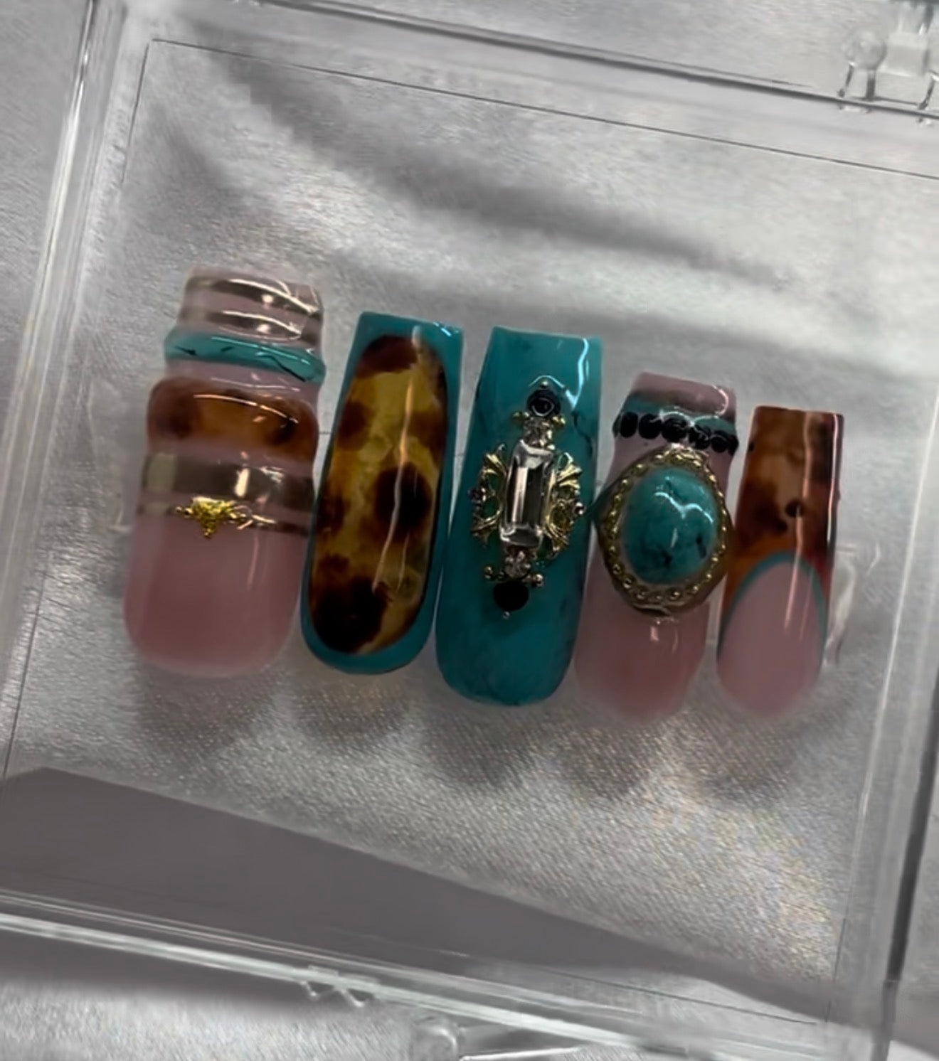 TURQS, a nail set with turquoise, tortoise prints, 3d aspects, & bangle trend. In the photo is what you will get being that this set is already made.